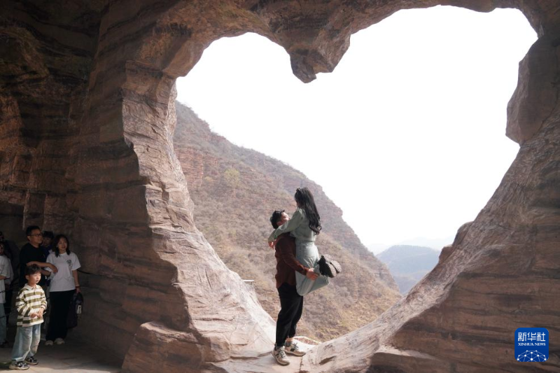 4月6日,游人在河北省邢臺(tái)市天河山景區(qū)的“心洞”拍照留念。