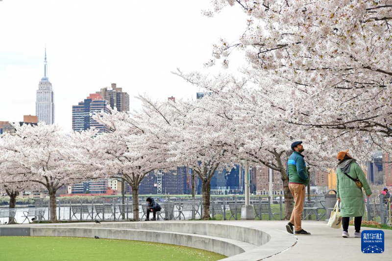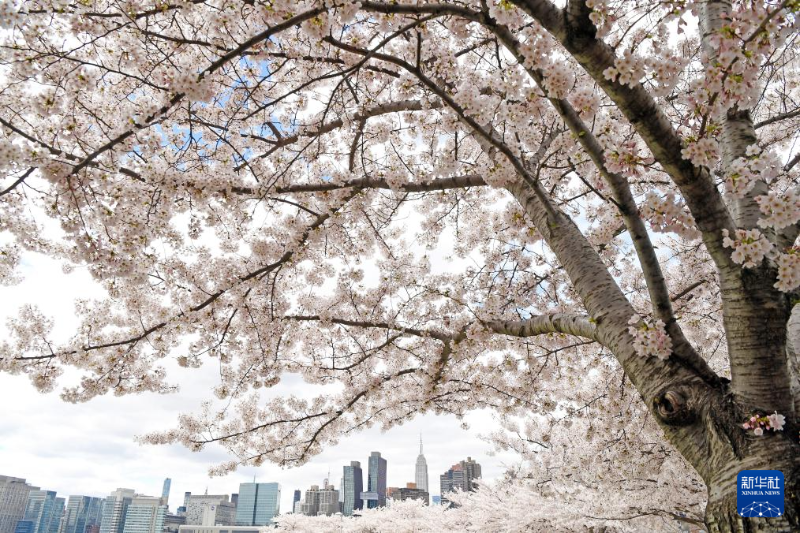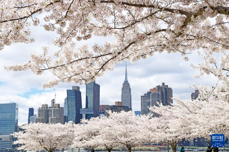 4月5日,在美國(guó)紐約,櫻花掩映遠(yuǎn)處的帝國(guó)大廈。