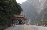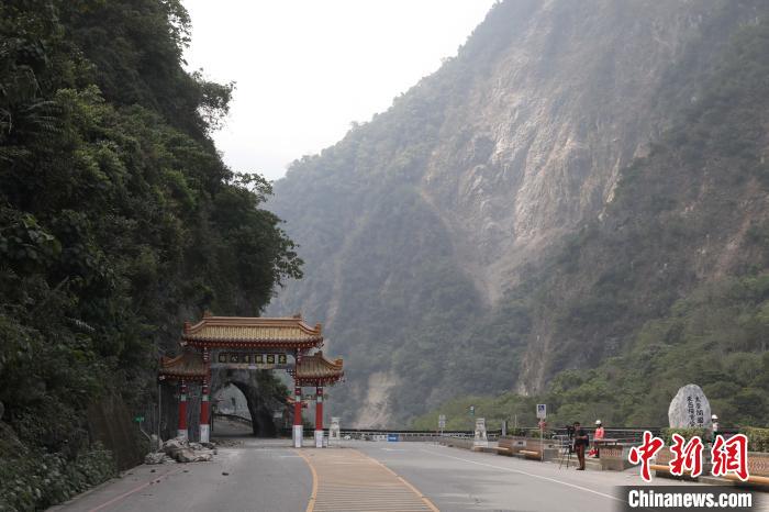 4月4日,位于太魯閣公園的中橫公路入口,立霧溪出??趦蓚?cè)山體有明顯滑坡痕跡?!皷|西橫貫公路”牌樓前,靠山體一側(cè)道路落滿大石。中新社記者 楊程晨 攝