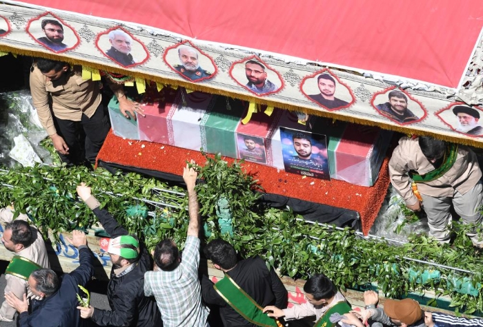 4月5日,在伊朗德黑蘭,人們參加伊朗駐敘使館遭襲事件中喪生的7名伊朗伊斯蘭革命衛(wèi)隊(duì)成員的葬禮。新華社記者沙達(dá)提攝