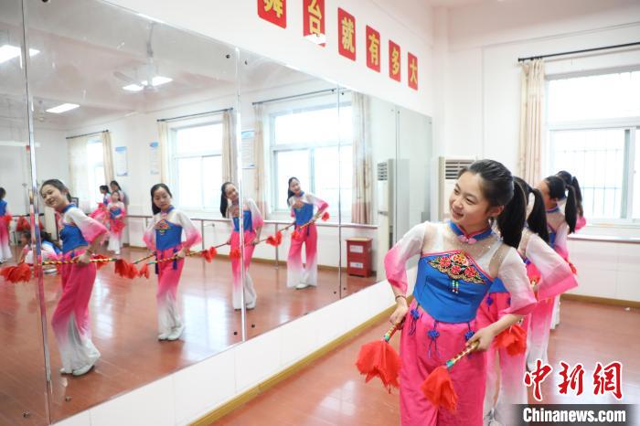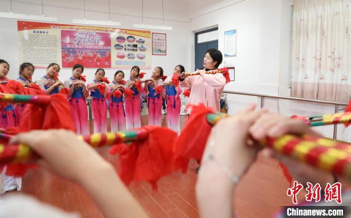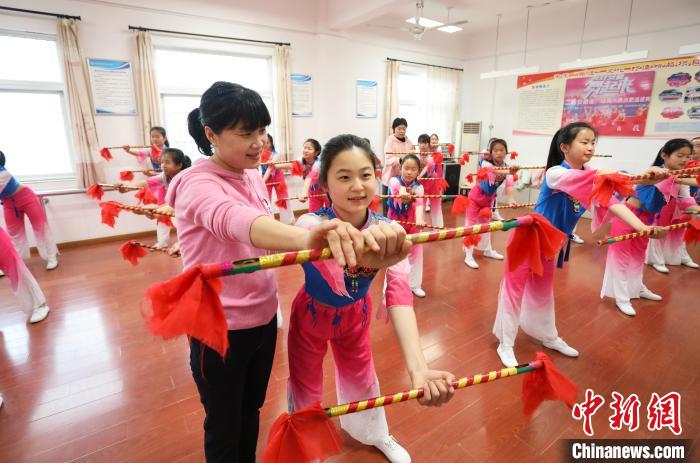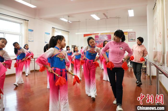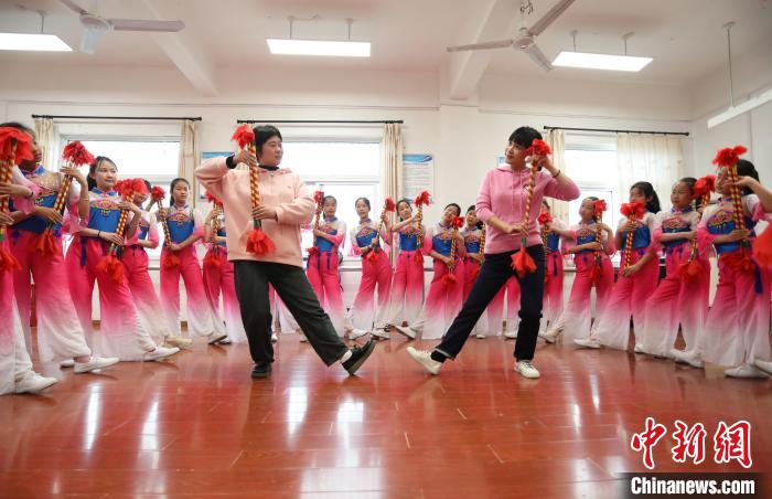 4月7日,在安徽省肥西縣柿樹崗鄉(xiāng)中心學(xué)校,蓮湘舞傳承人吳宗瓊老師和謝如夢(mèng)老師指導(dǎo)學(xué)生們練習(xí)蓮湘舞。