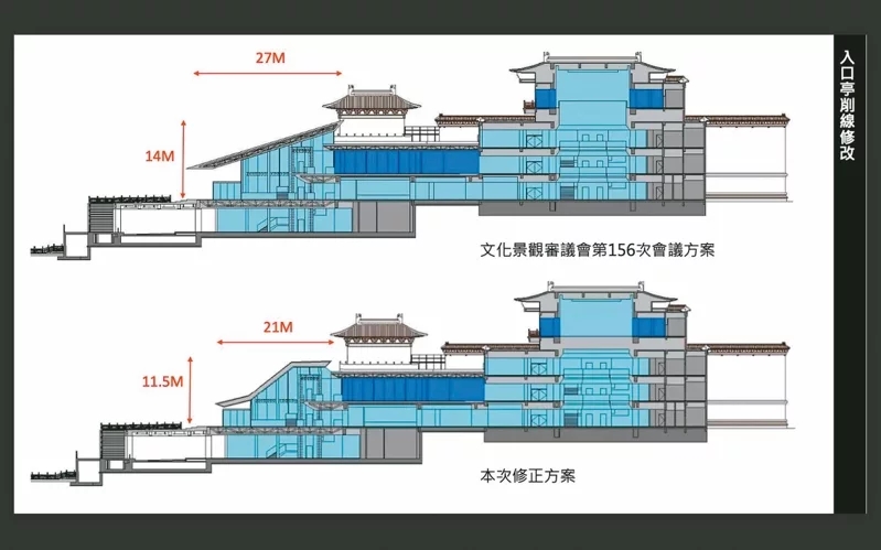 臺北故宮博物院北院整建最新方案,已將入口亭原斜屋頂做折面,總長度從27米縮為21米,入口亭高度也從14米減為11.5米。圖/臺灣《聯(lián)合報》