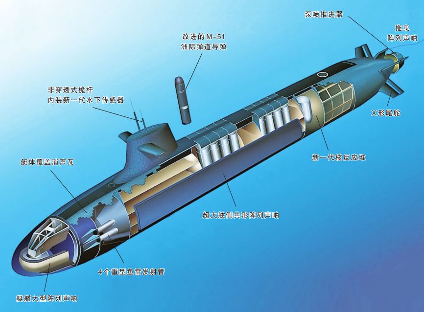 法國第三代彈道導(dǎo)彈核潛艇裝備16具垂直導(dǎo)彈發(fā)射筒,將搭載M-51洲際彈道導(dǎo)彈的最新型號(hào),具有突防力強(qiáng)、射程遠(yuǎn)、命中精度高等特點(diǎn),與上一代型號(hào)相比,該彈攜帶的核彈頭數(shù)量更多、智能化程度更高、毀傷效果更強(qiáng)。另外,第三代彈道導(dǎo)彈核潛艇艇艏布置4個(gè)重型魚雷發(fā)射管,可發(fā)射F-21重型魚雷、下一代反艦導(dǎo)彈等,還能發(fā)射無人潛航器等,使得該級(jí)艇的自衛(wèi)能力和對(duì)海攻擊作戰(zhàn)能力得到進(jìn)一步提升。