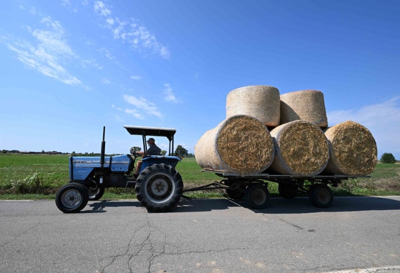 2022年8月12日,在意大利倫巴第大區(qū)曼托瓦,農(nóng)民運送草垛。新華社發(fā)(阿爾貝托·林格里亞攝)