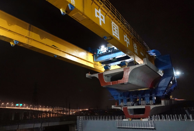 這是2024年3月4日凌晨拍攝的滬蘇湖鐵路全線最后一榀箱梁架設(shè)施工現(xiàn)場。當日,滬蘇湖鐵路全線箱梁架設(shè)完成。