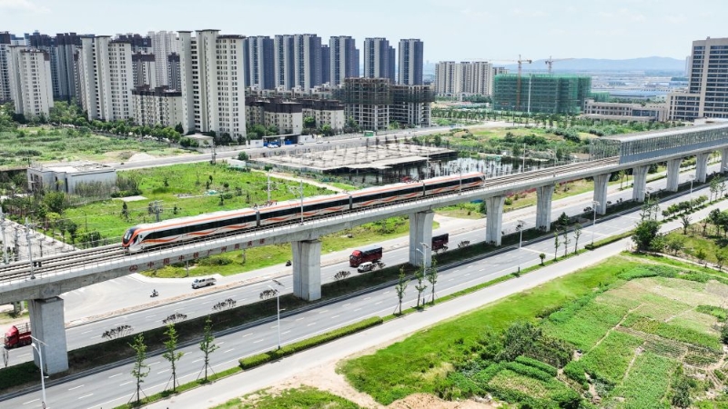 滁寧城際鐵路列車駛過安徽省滁州市來安縣境內(nèi)(2023年6月28日攝,無人機照片)。滁寧城際鐵路西起安徽滁州高鐵站,終到正在規(guī)劃建設(shè)中的南京北站,全長約55公里,設(shè)站17座,設(shè)計時速120公里。