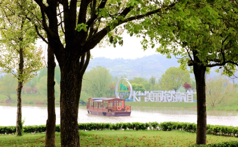2024年4月10日,游船在浙江省湖州市長興縣太湖圖影濕地的航道上航行。