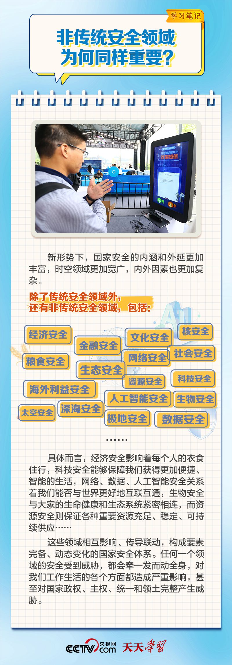 天天學(xué)習(xí)提起國家安全,很多人誤以為是遙遠(yuǎn)的“諜戰(zhàn)片”。其實(shí),國家安全涉及領(lǐng)域眾多,與每個人都息息相關(guān)。