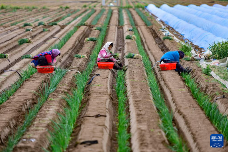 4月14日,在山東省青州市后坡村,農(nóng)民在田間栽植蔥苗。