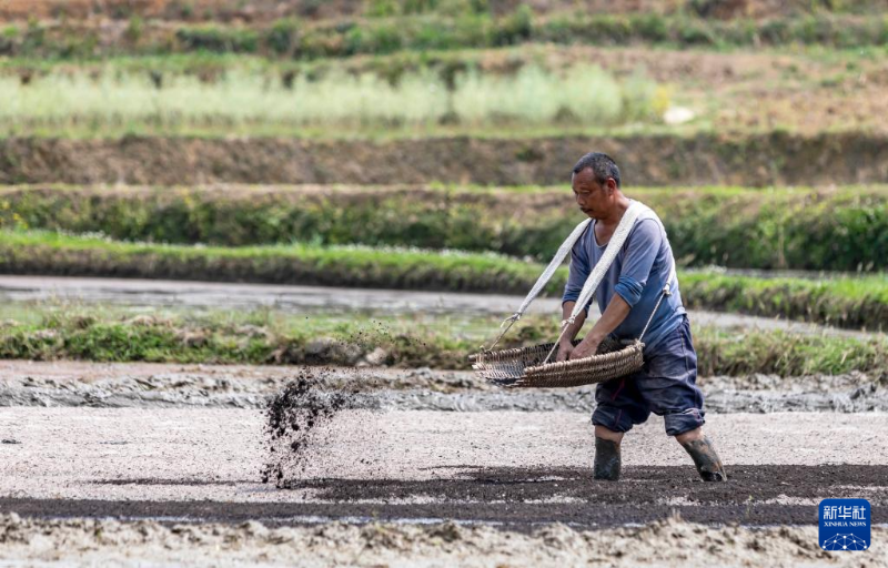 4月14日,村民在貴州省黔西市文峰街道雙星社區(qū)農(nóng)田播種育秧。