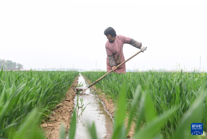 4月14日,河北省新樂(lè)市東名村農(nóng)民在麥田勞作。