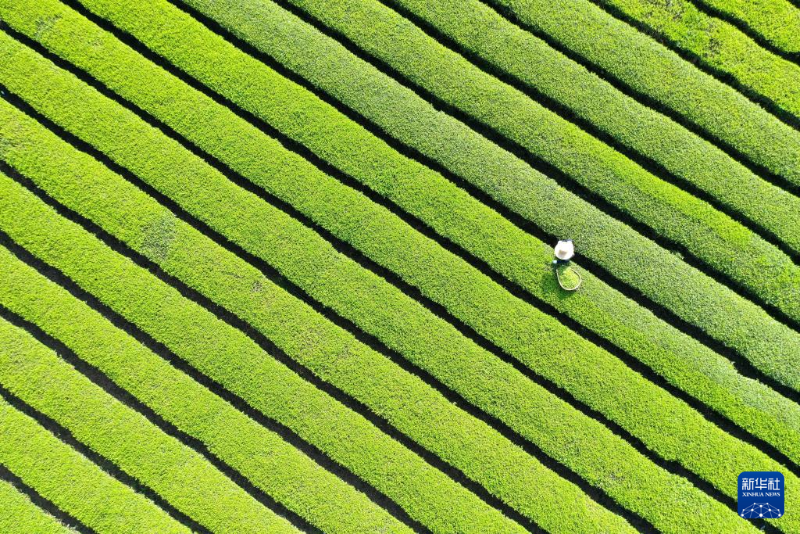 4月14日,茶農(nóng)在湖北省宣恩縣椒園鎮(zhèn)石馬村的茶園里采摘春茶(無(wú)人機(jī)照片)。