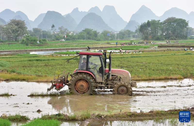 4月14日,在廣西賀州市平桂區(qū)鵝塘鎮(zhèn)鵝塘村,農(nóng)機(jī)手駕駛拖拉機(jī)耕田。