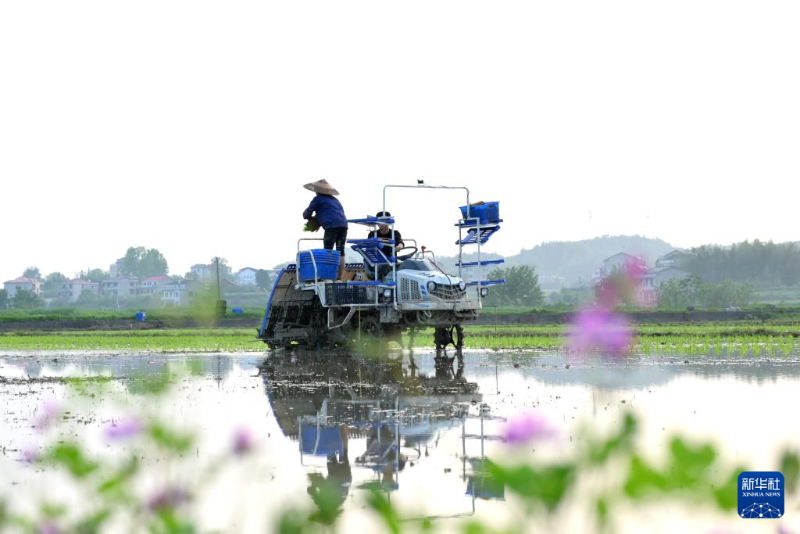 4月14日,在湖南省婁底市雙峰縣永豐街道泥灣村高標(biāo)準(zhǔn)農(nóng)田,農(nóng)民駕駛插秧機(jī)移栽早稻秧苗。
