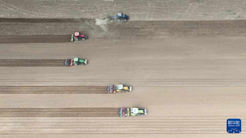 4月13日,農(nóng)民駕駛農(nóng)機(jī)在河北省滄州市東光縣一處花生種植基地里忙碌(無(wú)人機(jī)照片)。
