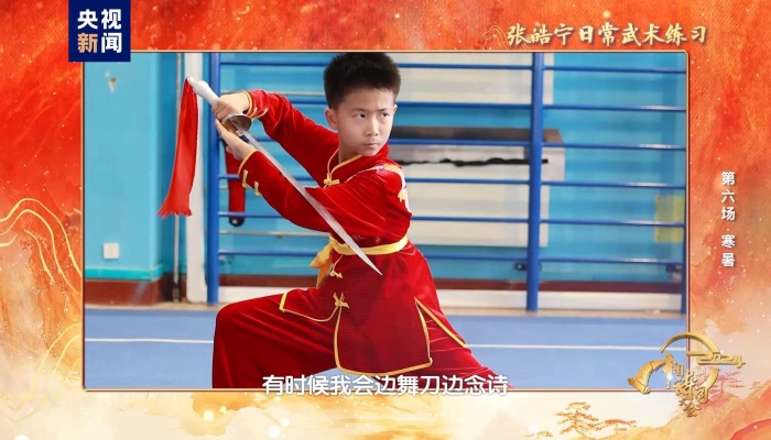 少年如初春之萌動,如朝日之蓬勃,如百卉之含苞?!谤i北海,鳳朝陽,又?jǐn)y書劍路茫茫”,說起蓬勃春機(jī),沒有什么比少年人更適合。當(dāng)一襲紅衣的武術(shù)少年張皓寧剛一登場,就讓大家眼前一亮:三歲讀詩、四歲習(xí)武、邊舞刀邊念詩的他,小小年紀(jì)就展現(xiàn)出“銀鞍照白馬、颯沓如流星”的唐代俠客風(fēng)貌。