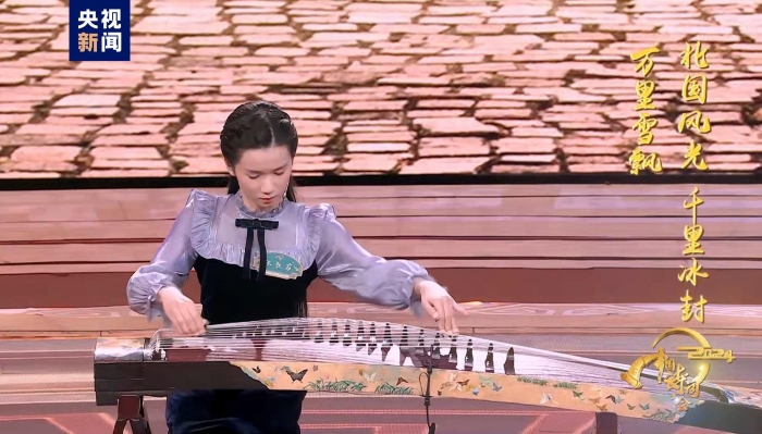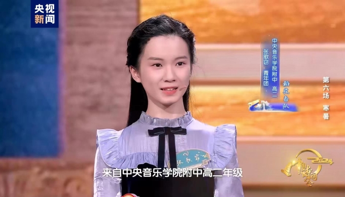 “誦明月之詩,歌窈窕之章”,來自中央音樂學(xué)院附中古箏專業(yè)的少女張歌窈在登場時向全場觀眾展示了自己的拿手絕活:用古箏表達(dá)詩詞意境,“嘈嘈切切錯雜彈,大珠小珠落玉盤”,在她的指尖流淌出毛主席筆下“北國風(fēng)光,千里冰封,萬里雪飄”的冬日蕭瑟,于音律浮動間盡傳千古之妙,技驚四座,令主持人和嘉賓都贊嘆不已。