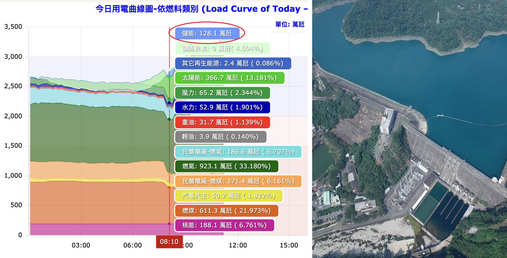網(wǎng)絡(luò)媒體以為臺(tái)電的儲(chǔ)能系統(tǒng)是指“電池儲(chǔ)能”,其實(shí)臺(tái)電主要的儲(chǔ)能是抽蓄水力,右圖為明潭抽蓄水力電廠。(圖/臺(tái)電)