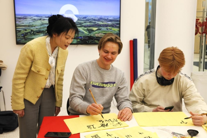 4月20日,在挪威首都奧斯陸,當?shù)孛癖娫谥形娜諔c祝活動上體驗書法。新華社記者 張玉亮 攝