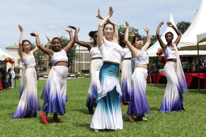 4月20日,在烏干達坎帕拉,中文師生在麥克雷雷大學舉行的中文日慶祝活動上表演中國舞蹈節(jié)目。新華社發(fā)(阿佳拉·納瓦達攝)