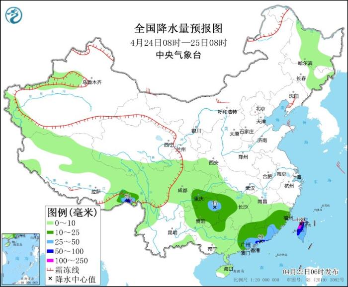4月24日8時至25日8時,西藏東南部、重慶南部、貴陽中東部、湖南中西部、江西南部、廣西北部、廣東大部、福建中南部、臺灣島等地部分地區(qū)有中到大雨,其中,西藏東南部、廣東東南部沿海、臺灣島西部、西藏東南部等地部分地區(qū)有暴雨或大暴雨(100~180毫米)。內(nèi)蒙古中西部、遼東半島、山東半島、西藏南部等地部分地區(qū)有4~5級風(fēng)。