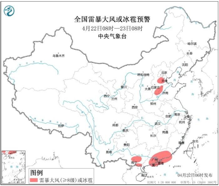 預(yù)計(jì),4月22日8時至23日8時,福建東南部、廣東中東部和南部、廣西東部等地部分地區(qū)有大到暴雨,其中,廣東東南部的部分地區(qū)有大暴雨(100~160毫米);河北中南部、天津西南部、山東北部、河南北部、廣西東南部及沿海、廣東中南部及沿海等地的部分地區(qū)將有8-10級雷暴大風(fēng)或冰雹天氣,局地風(fēng)力可達(dá)11級以上;福建東部和南部、貴州南部、廣西、廣東等地的部分地區(qū)將有短時強(qiáng)降水天氣,最大小時雨量30-50毫米,局地可達(dá)70毫米以上。中央氣象臺4月22日6時發(fā)布暴雨黃色預(yù)警和強(qiáng)對流天氣藍(lán)色預(yù)警。