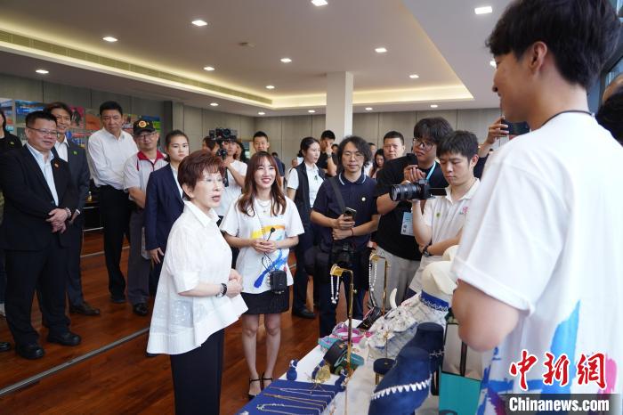 洪秀柱一行21日下午前往深圳市中山公園棒球場會議室,參觀了數(shù)名在深創(chuàng)業(yè)的臺灣青年的成果展示,了解他們的創(chuàng)業(yè)情況,并與他們交談。