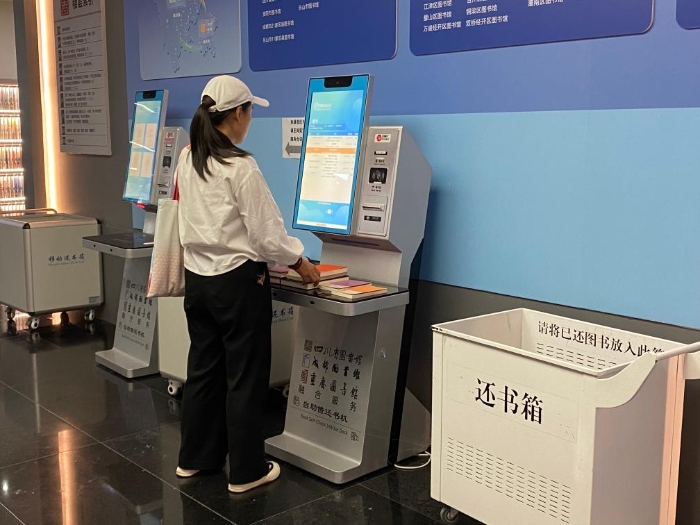 在四川省圖書館,讀者正在使用自助借還書機批量還書。新華社記者周以航 攝