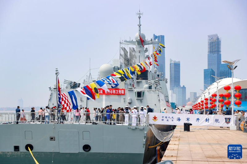 海軍開封艦在山東青島奧帆中心碼頭靠泊開放展示(4月22日攝)。新華社發(fā)(劉再耀 攝)
