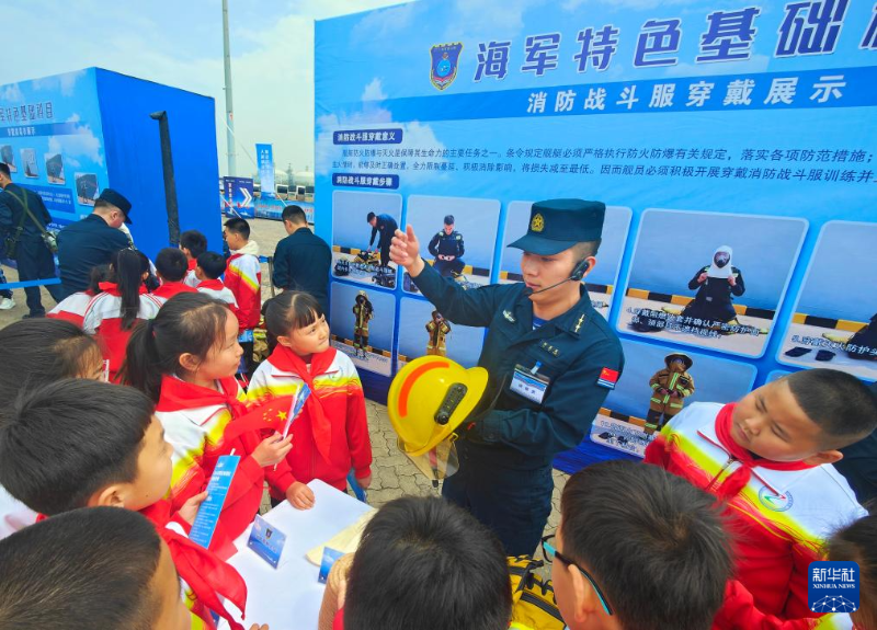 海軍唐山艦靠泊河北省唐山市開放展示,官兵為小學(xué)生演示消防戰(zhàn)斗服穿戴(4月20日攝)。新華社發(fā)(馬玉彬 攝)