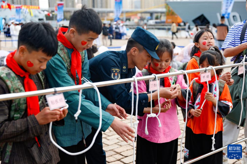海軍在山東青島港3號碼頭組織艦艇開放活動,小朋友體驗打繩結(jié)(4月20日攝)。新華社發(fā)(劉再耀 攝)