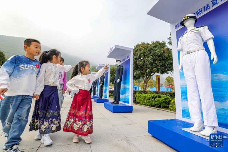 東部戰(zhàn)區(qū)海軍某護(hù)衛(wèi)艦支隊組織軍營開放,小朋友走進(jìn)福建寧德某軍港參觀海軍軍服展示區(qū)(4月20日攝)。新華社發(fā)(吳帥廣 攝)