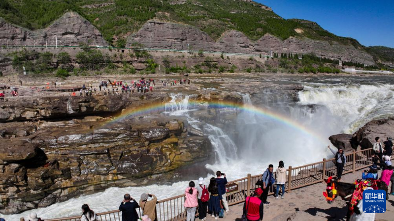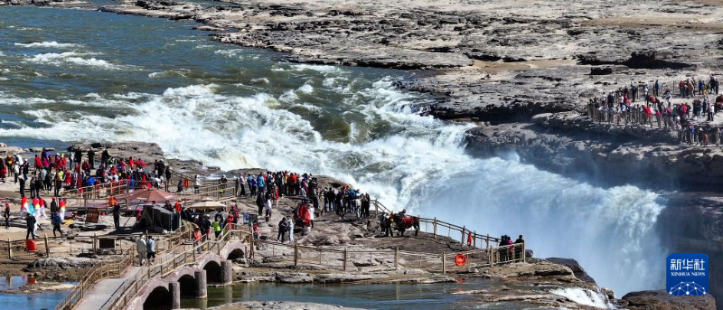 4月23日,游客在山西吉縣黃河壺口瀑布觀賞“清流飛瀑”景觀(無人機照片)。