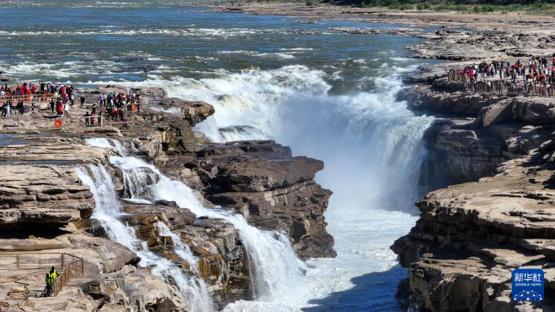 近日,受上游降雨量較少和水庫調(diào)節(jié)水量影響,黃河晉陜峽谷水流變緩,水色變清,壺口瀑布出現(xiàn)“清流飛瀑”景觀。