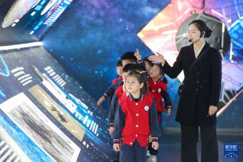4月24日,在山東省棗莊市科技館,小朋友在宇宙探索展廳學(xué)習(xí)航天知識。