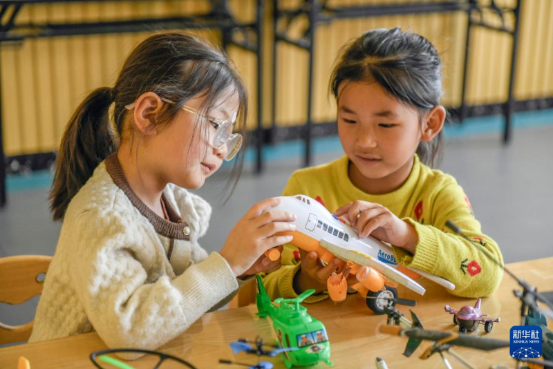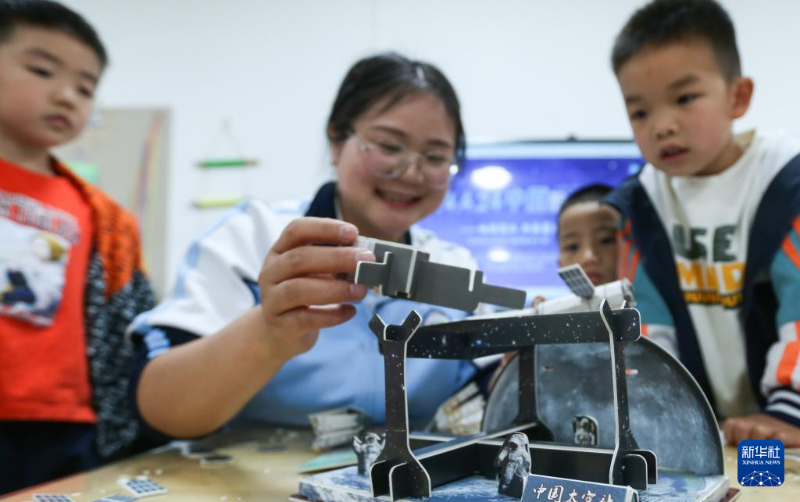 4月24日,貴州省都勻市青云湖幼兒園的老師和孩子們一起拼裝空間站模型。