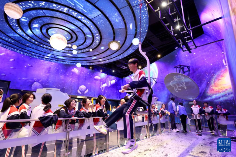 4月24日,在山東省棗莊市科技館,學(xué)生在體驗“月球漫步”。