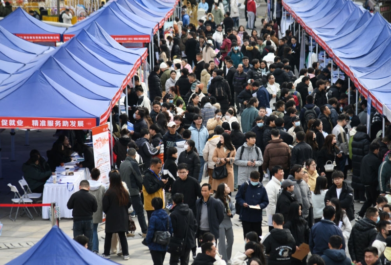 求職者在2024年陜西工會(huì)“春送崗位”就業(yè)服務(wù)月現(xiàn)場(chǎng)招聘會(huì)上了解招聘信息(2024年3月6日攝)。新華社記者 張博文 攝