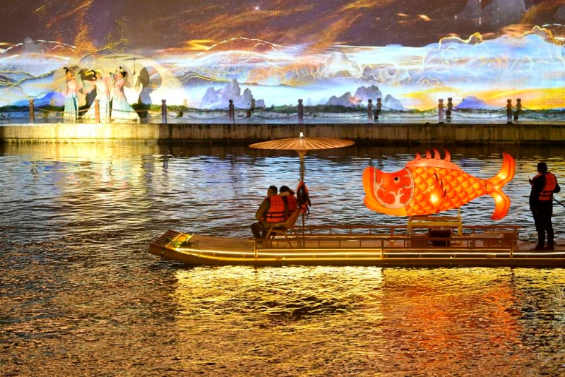 游客乘坐竹筏在湖北省宣恩縣貢水河上觀看河岸實(shí)景歌舞表演(2024年2月20日攝)。春節(jié)期間,當(dāng)?shù)亟M織豐富多彩的文化活動(dòng),吸引大批游客前來(lái)賞景游玩,為山鄉(xiāng)經(jīng)濟(jì)注入活動(dòng)。新華社發(fā)(宋文 攝)