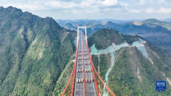 2021年11月30日在貴州省貴定縣拍攝的進(jìn)行靜態(tài)荷載試驗(yàn)的陽寶山特大橋(圖源:新華社)。
