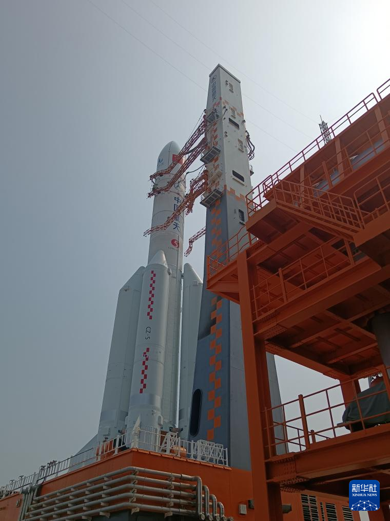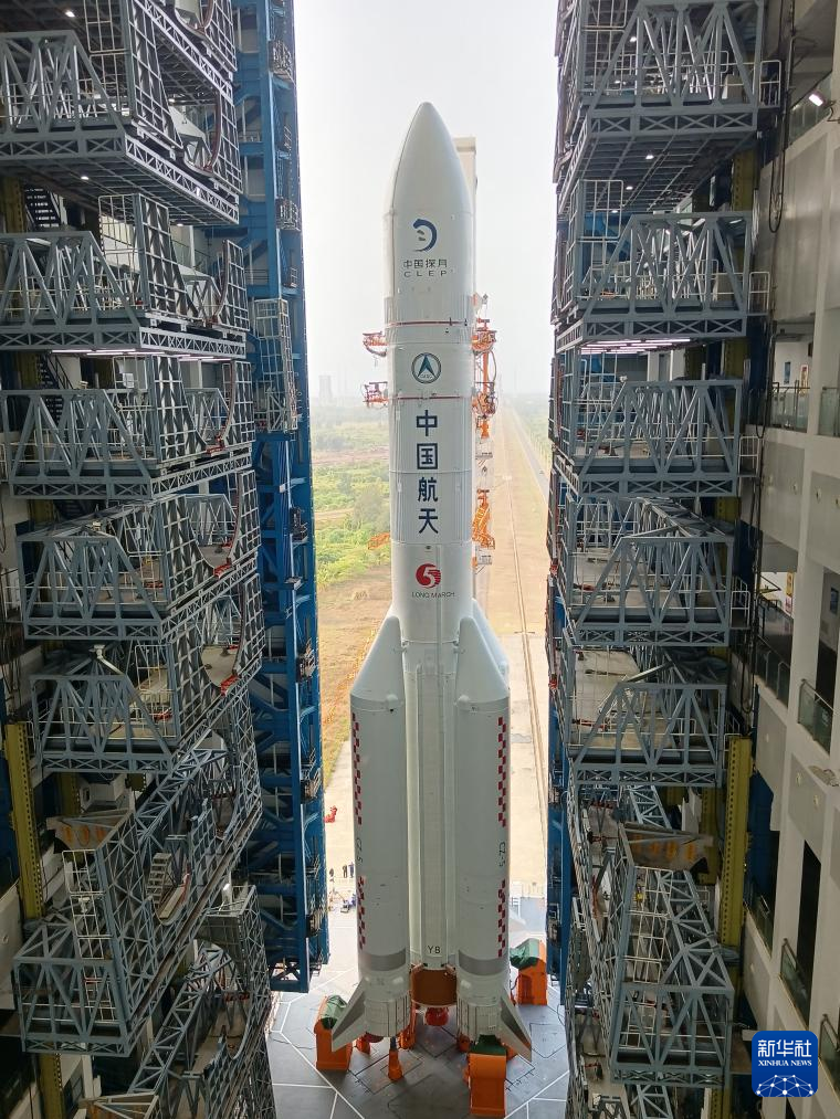 4月27日,嫦娥六號探測器和長征五號遙八運載火箭器箭組合體在垂直轉(zhuǎn)運中。