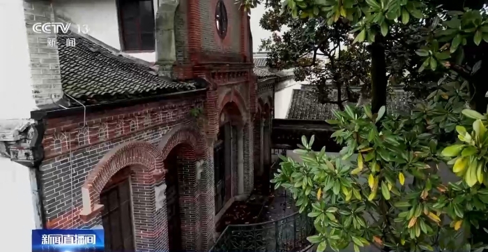 像這樣中西合璧的百年建筑,是南潯古鎮(zhèn)建筑的獨(dú)有特色。這些建筑既引入西方建筑的元素,又傳承了中國古典人文精神。這棟傳統(tǒng)中式房屋的窗戶玻璃,鑲嵌的是法國進(jìn)口的藍(lán)晶玻璃,上面定制的圖案卻是中國的花卉、瓜果等。