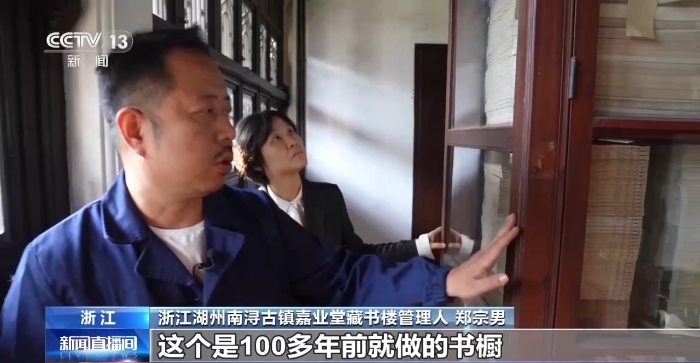 浙江湖州南潯古鎮(zhèn)嘉業(yè)堂藏書樓管理人鄭宗男:嘉業(yè)藏書樓最重要的一項(xiàng)工作就是古籍保護(hù),這個是100多年前就做的書櫥,用的材質(zhì)是防蟲效果非常好的柚木。窗戶有兩扇,外面是白鐵皮,避免陽光對書籍的直射。江南地區(qū)比較潮濕,怎么防范對書籍造成的破壞?像太陽剛剛升起的時候,上午就打開西廂房的窗戶,等到午后再把東廂房的窗戶打開,這樣既可以讓書本得到一個順暢的呼吸,又避免遭到陽光的直射。