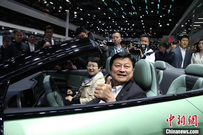 4月28日,中國國民黨民意代表參訪團走進2024北京國際汽車展覽會,圖為傅崐萁坐進車中體驗。朱賀 攝