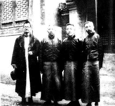 1920年3月14日,胡適與蔡元培、蔣夢麟(左一)、李大釗(右一)合影于北京西山