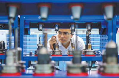 中國(guó)船舶集團(tuán)的數(shù)控工藝師在檢查用于精密機(jī)械制造的數(shù)控加工刀具。
