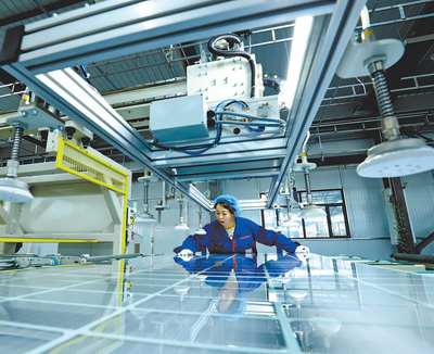 甘肅省張掖市民樂(lè)生態(tài)工業(yè)園區(qū)的甘肅大民新材料光伏組件生產(chǎn)線上,工作人員正在檢測(cè)覆膜前光伏組件。