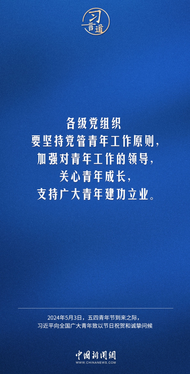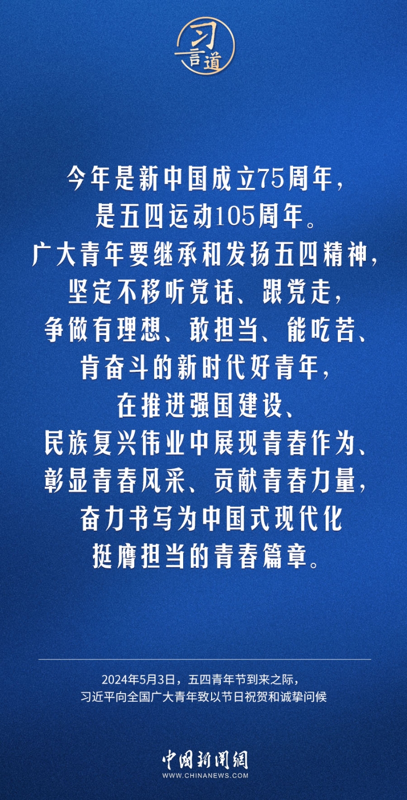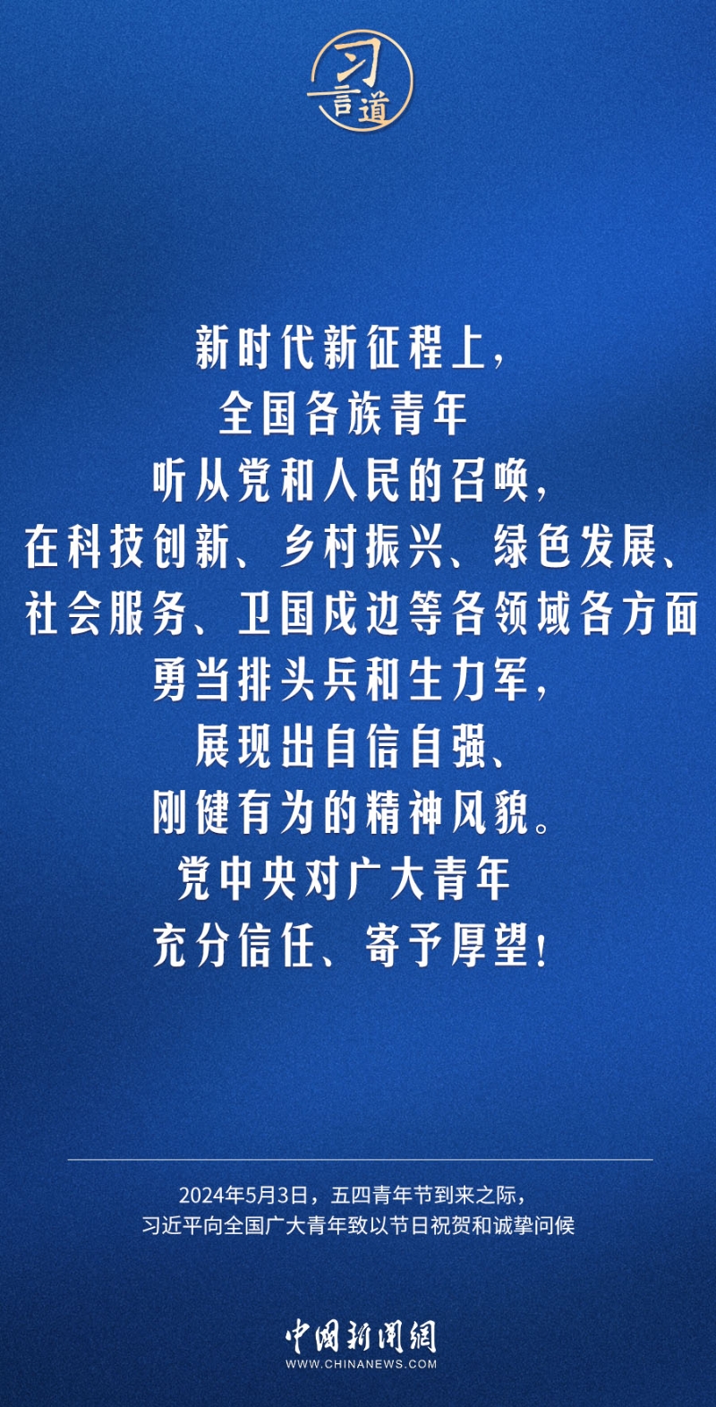 在五四青年節(jié)到來(lái)之際,中共中央總書(shū)記、國(guó)家主席、中央軍委主席習(xí)近平代表黨中央,向全國(guó)廣大青年致以節(jié)日祝賀和誠(chéng)摯問(wèn)候。