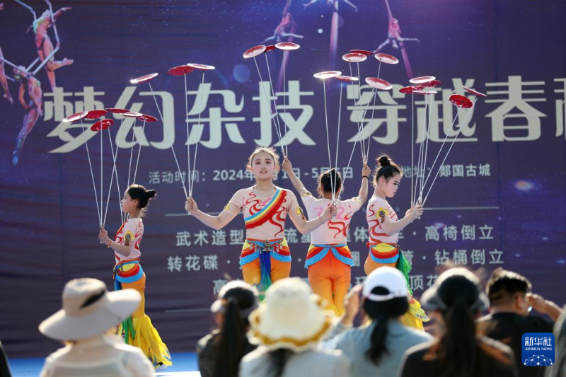5月1日,游客在山東省郯城縣郯國古城景區(qū)觀看雜技表演。新華社發(fā)(張春雷攝)