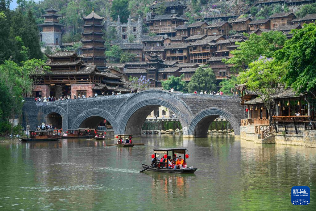 5月4日,游客乘船在貴州省黔西南布依族苗族自治州興義市峰林布依景區(qū)游覽。(圖源:新華社)